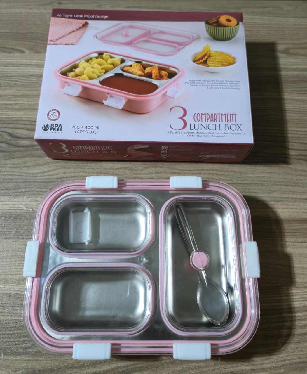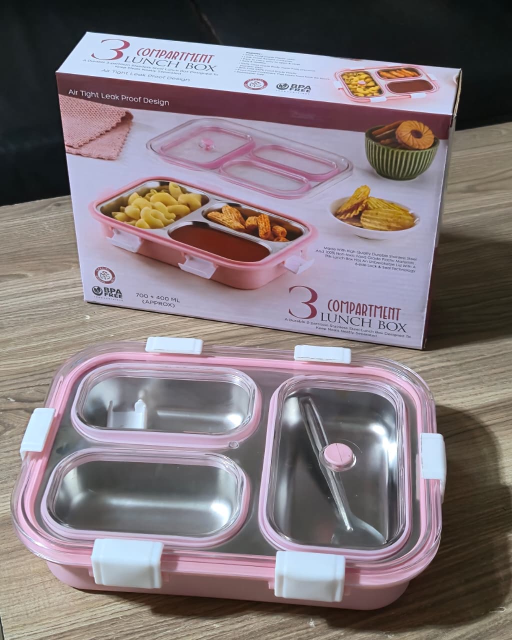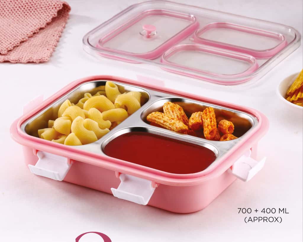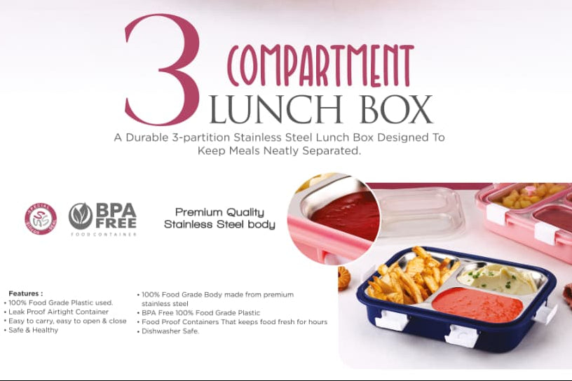 Engineered for durability and practicality, this stainless steel lunch box features three separate compartments designed to keep your meals organized and fresh throughout the day.