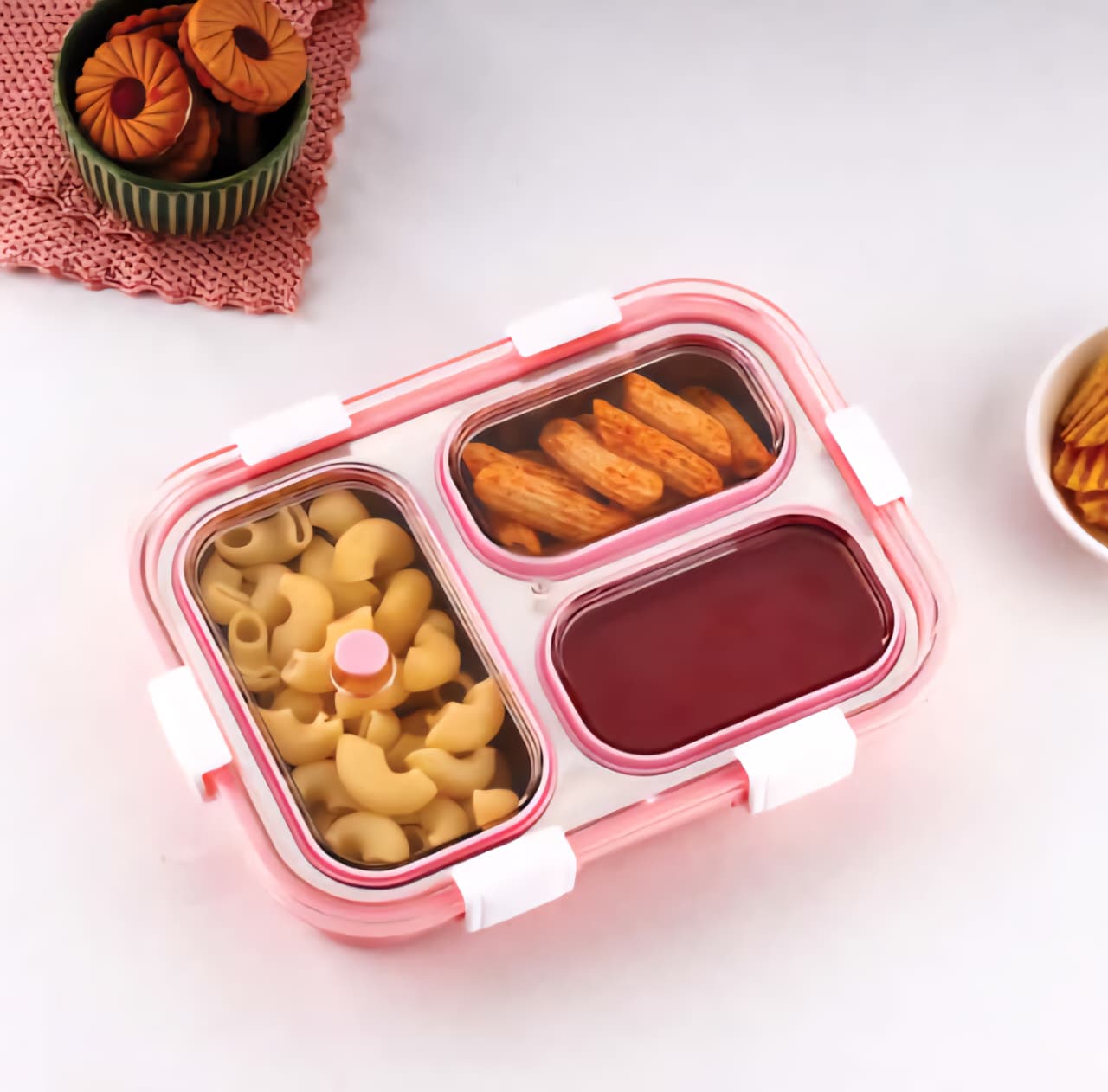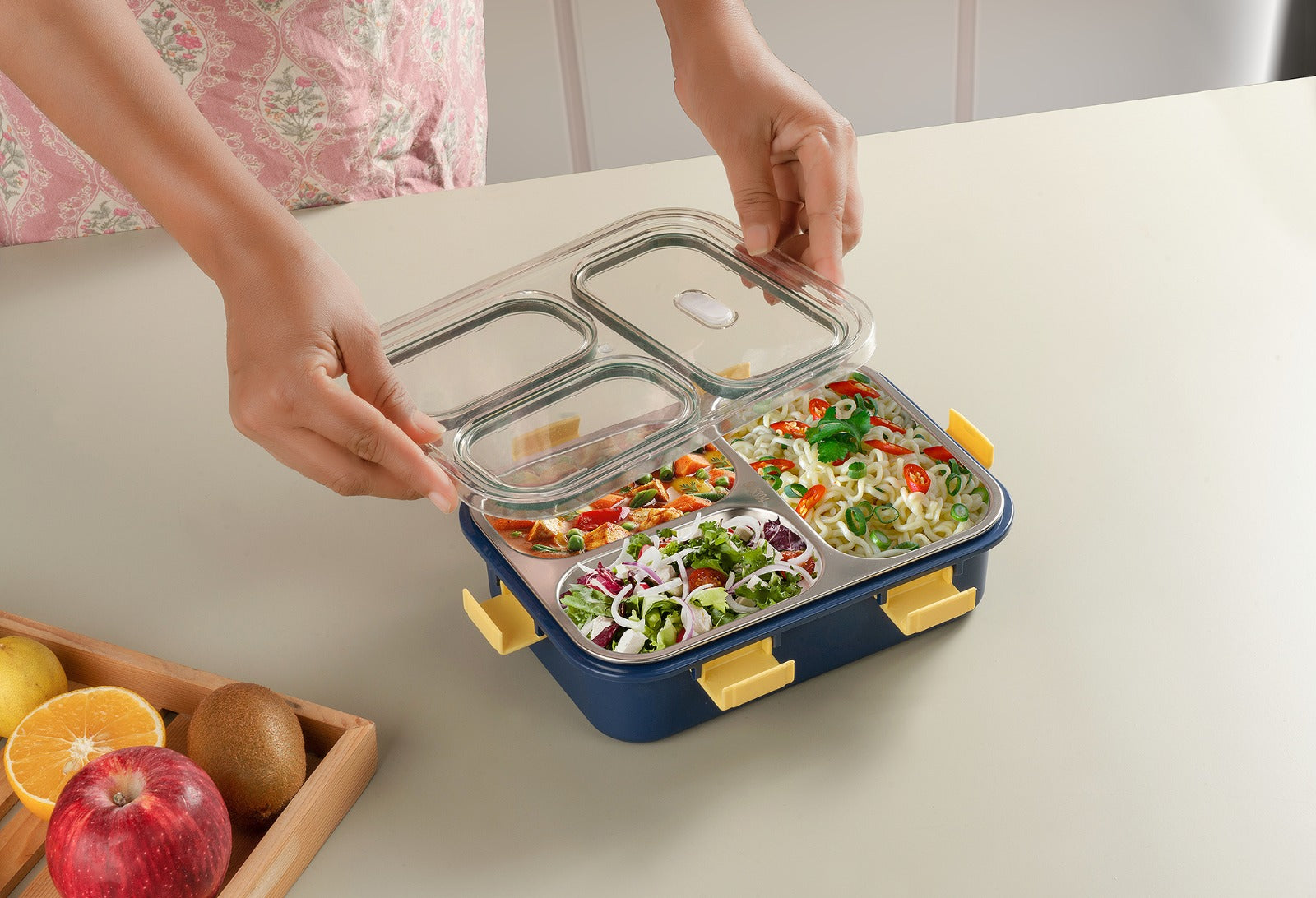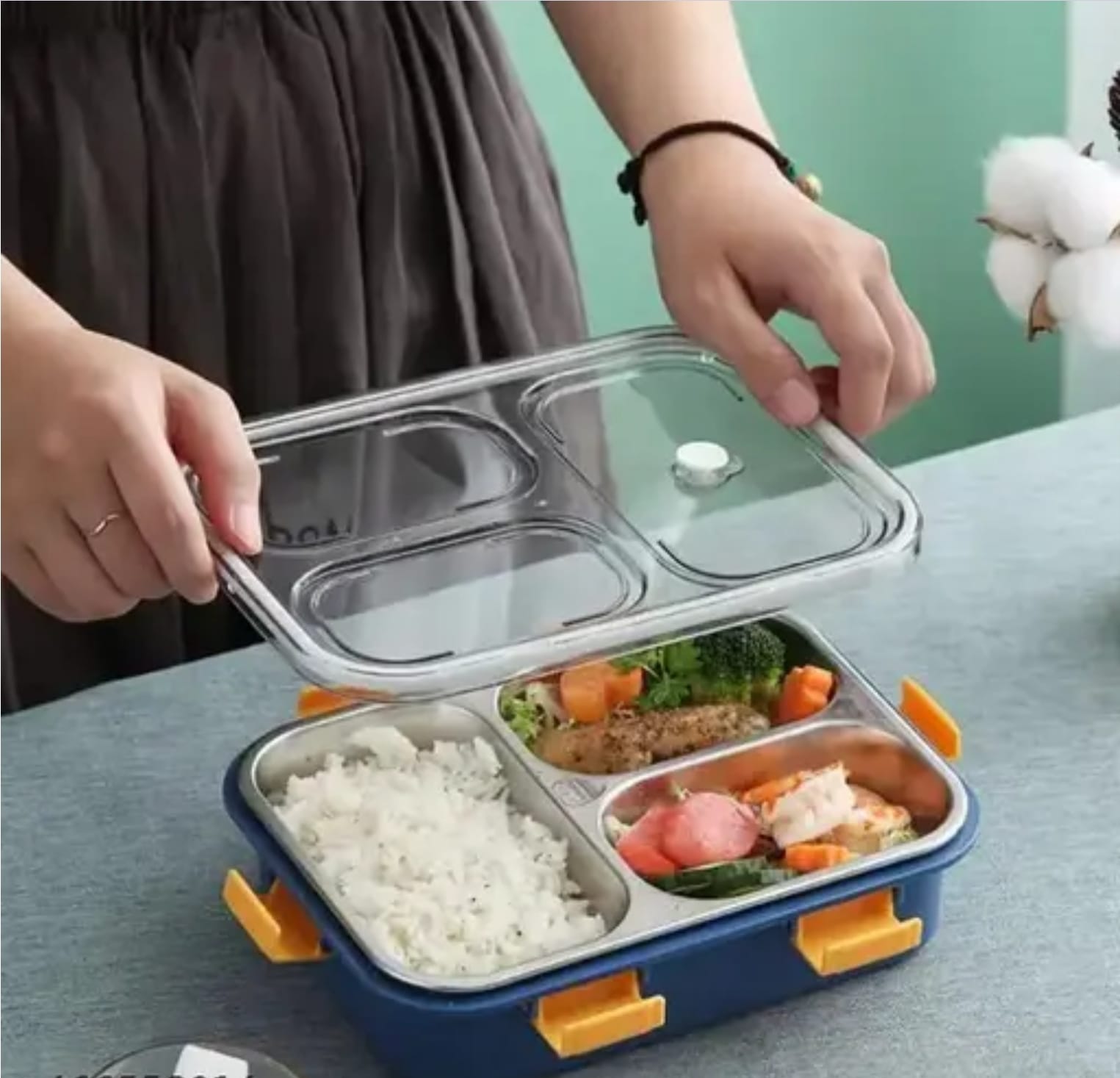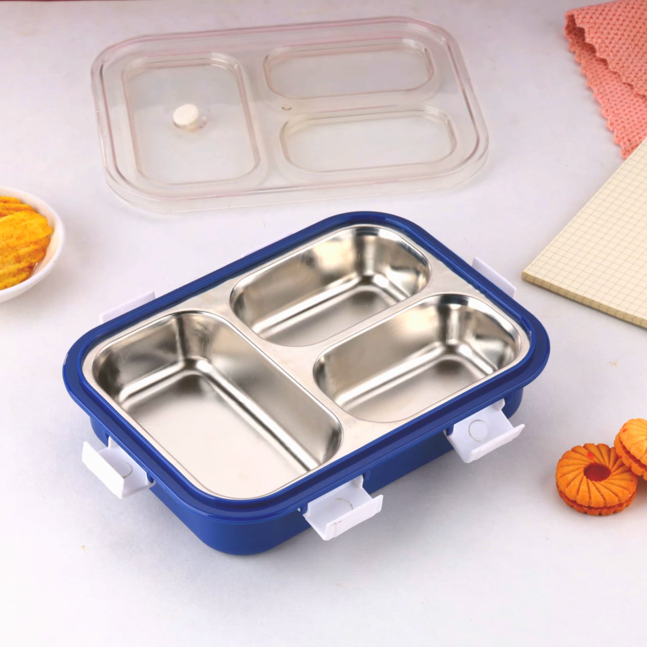 Engineered for durability and practicality, this stainless steel lunch box features three separate compartments designed to keep your meals organized and fresh throughout the day.